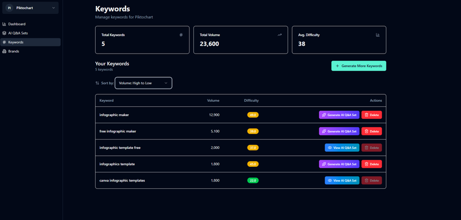 Each keyword connects to search volume, difficulty, and potential variations — forming the foundation for your future AI Q&A Sets and Recommendations.