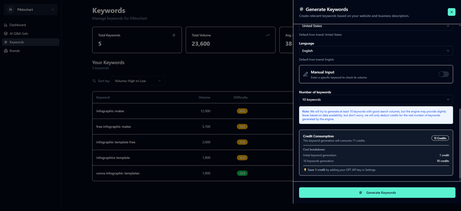 Manual Input: Usually consumes 2 credits, covering both the keyword and its variation checks.