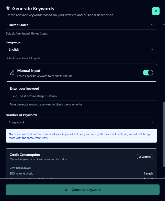 💡 Tip: Low or missing volume doesn’t mean the idea is bad - it just means users aren’t searching for it yet. Combine both AI and Manual modes to balance creativity with data.